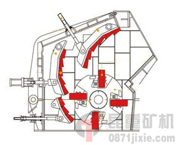 反擊式破碎機的工作原理和錘式破碎機相近,都是利用高速回轉的錘頭沖擊物料而使之破碎的,不過兩者的破碎過程卻不盡相同。當物料進入破碎腔后即受到高速回轉的板錘的沖擊而進行選擇性破碎。物料從沖擊過程中獲得巨大的動能,并以高速拋向第一級反擊板,由于反擊板的反擊作用,物料再次受到破碎,被反擊板彈回來的物料又再次受到板錘的沖擊,繼續重復上述破碎過程。之后,此破碎物料又同樣以高速被拋向第二級反擊板,進一步得到破碎。這樣,物料經過板錘、反擊板的連續多次撞擊作用以及物料之間的相簿碰撞作用,便不斷沿自身的節理面產生裂縫、松散而被破碎。其力度小于板錘和反擊板之間的縫隙時,就從機器下部排出成為合格產品。在砂石廠聯破作業一般配置在顎式破碎機后面。