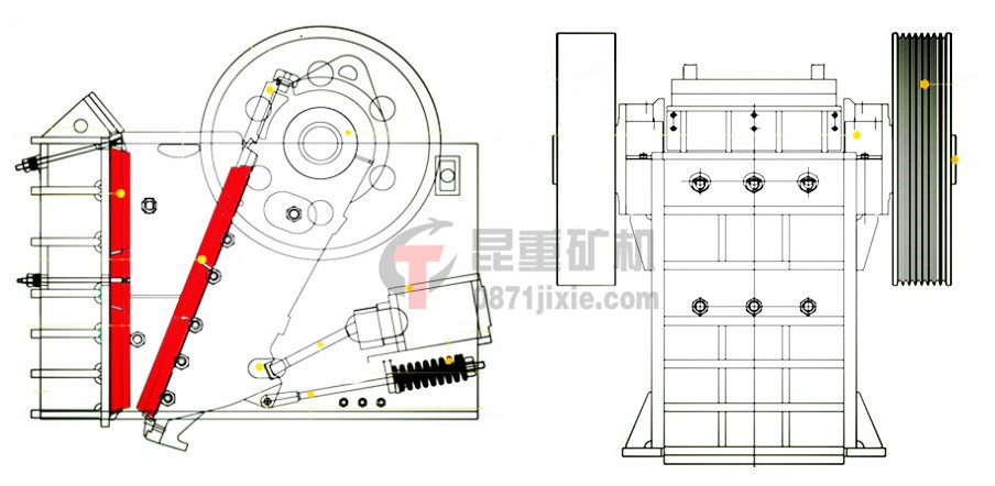顎式破碎機的工作方式是由電動機驅動皮帶和皮帶輪,通過偏心軸使動顎上下運動,當動顎上升時肘板與動顎間夾角變大,從而推動動顎板向固定顎板接近,與其同時物料被壓碎或劈碎,達到破碎的目的。當動顎下行時,肘板與動顎夾角變小,動顎板在拉桿,彈簧的作用下,離開固定顎板,此時已破碎物料從破碎腔下口排出。隨著電動機連續(xù)轉動而破碎機動顎做周期運動壓碎和排泄物料,實現(xiàn)批量生產(chǎn)。