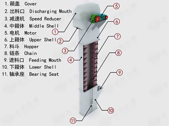 斗式提升機是利用均勻固接于無端牽引構(gòu)件上的一系列料斗,豎向提升物料的連續(xù)輸送機械。分為環(huán)鏈、板鏈和皮帶三種。