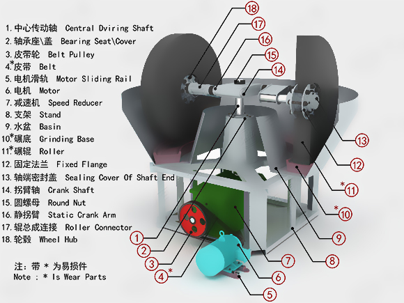 濕碾機(jī)采用輪動(dòng)式磨礦的工作方式:首先電動(dòng)機(jī)將動(dòng)力傳動(dòng)至減速機(jī),在減速機(jī)帶動(dòng)下,通過(guò)大立軸將力矩傳遞給上方的橫軸,然后經(jīng)安裝在橫軸兩端的拉桿傳遞至碾輪,使碾輪產(chǎn)生驅(qū)動(dòng)力,沿橫軸水平方向做逆時(shí)針旋轉(zhuǎn)運(yùn)動(dòng);工作時(shí)的碾輪既能圍繞濕碾機(jī)大立軸公轉(zhuǎn),又能圍繞碾輪中心軸進(jìn)行自轉(zhuǎn),碾盤則固定不動(dòng)。添加的礦石物料,在碾磨機(jī)內(nèi)受到來(lái)自碾輪自身重量帶來(lái)的擠壓力,碾輪公轉(zhuǎn)自轉(zhuǎn)時(shí)與碾盤產(chǎn)生的巨大摩擦力,在受到反復(fù)的擠壓、揉搓、研磨后,被徹底粉碎。