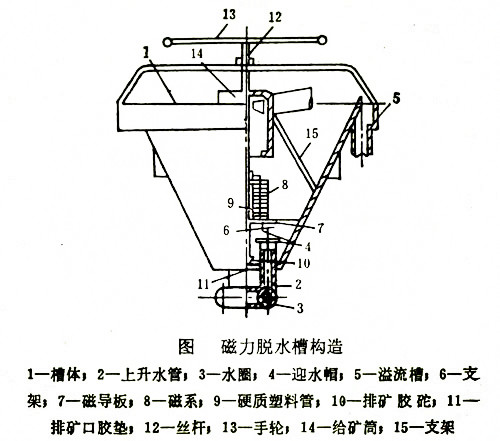 磁力脫水槽內磁場特性應在軸向和徑向都有梯度。在相同的條件下,軸向梯度大,徑向梯度小時,磁性礦粒下降的速度較快,對提高處理能力有利。反之,徑向梯度大,軸向梯度小時,磁鏈往往呈水平或近似水平狀態下降,所受到的上升水流阻力大,礦粒的沉降速度慢,影響處理能力,但此時磁鏈在下降過程中能受到較好的沖洗作用,對提高精礦質量有利,故應根據磁力脫水槽的不同用途來考慮磁性特點。