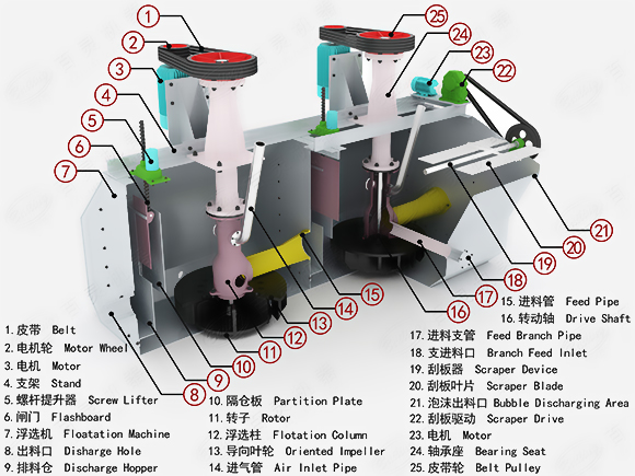 2、葉輪帶有后傾式雙面葉片,可實現槽內礦漿雙循環;前傾式槽體,死角小,泡沫運動速度快。