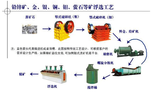 金礦的浮選工藝流程主要特點是浮出金(在礦石中金的含量是很少的),特別是回收存在于毒砂或黃鐵礦顆粒中的金,可把它們選到硫化物精礦中。浮選所得含金硫化物精礦,如果能用氰化物浸出,則在細磨后進行氰化浸出;如果不能氰化,則必須通過焙燒或冶煉處理。